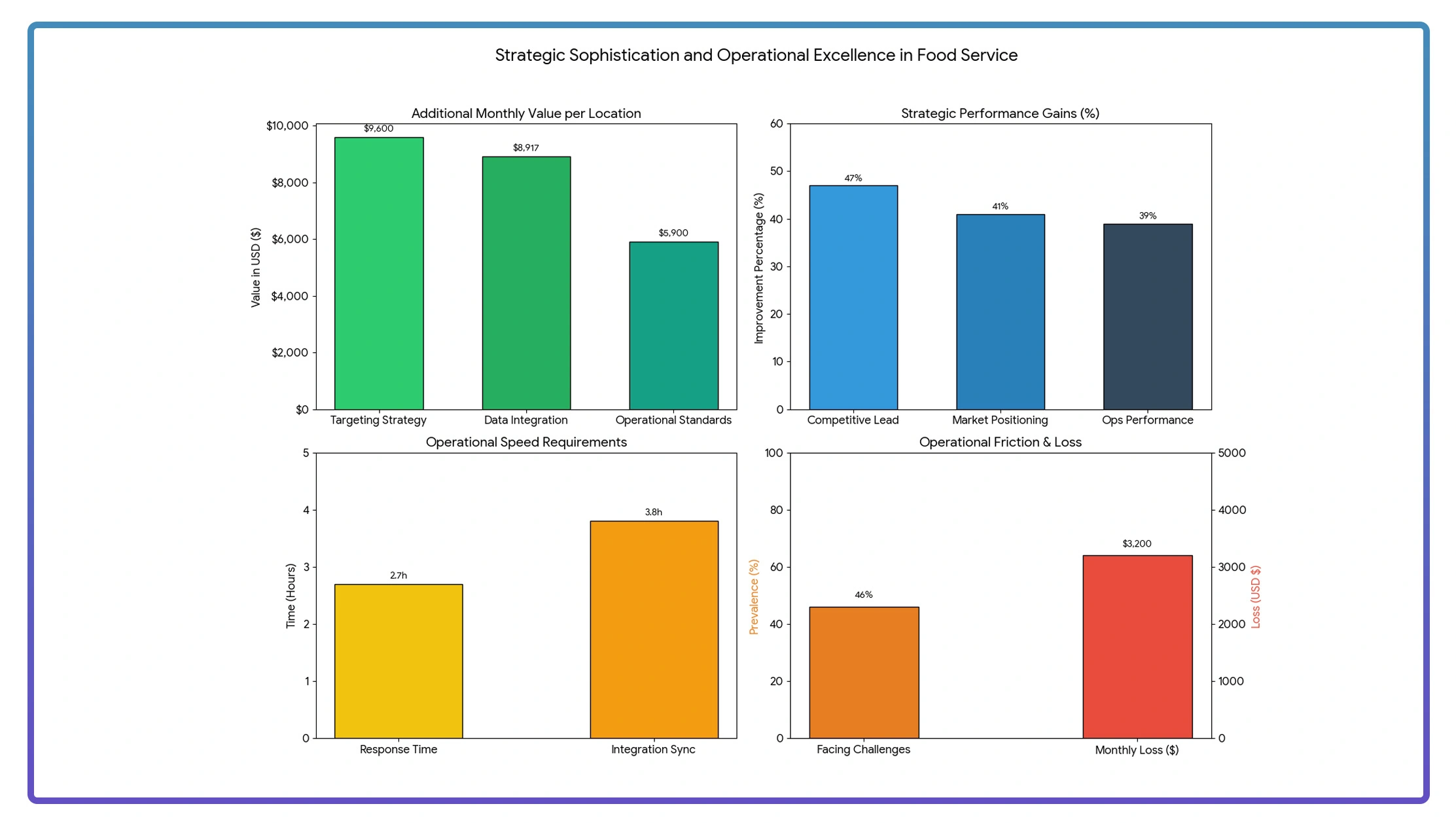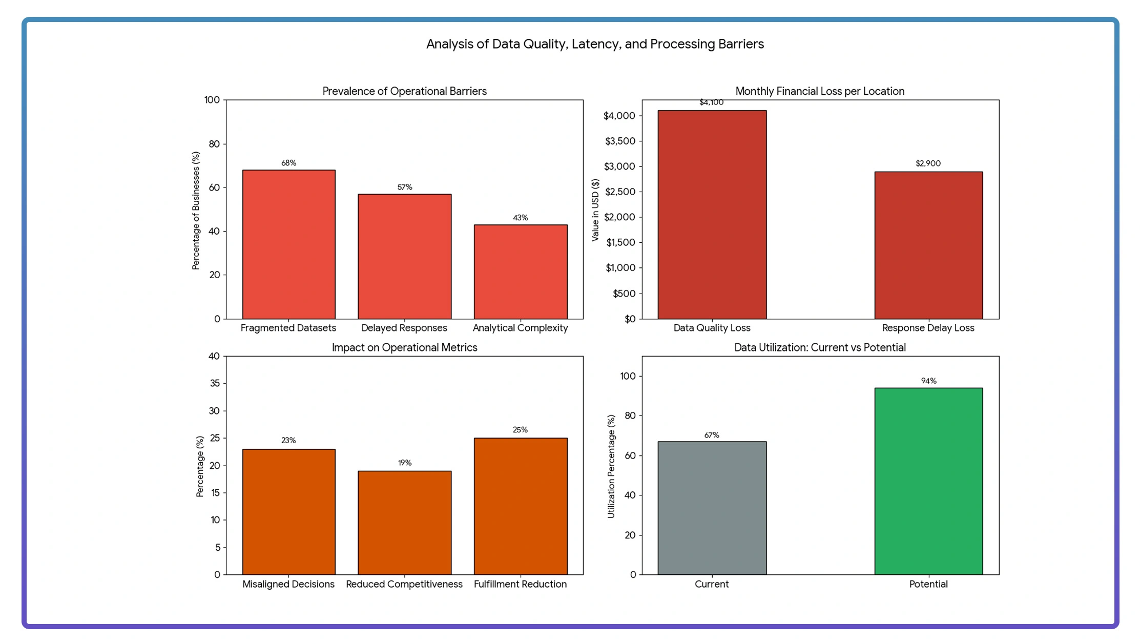Lack of infrastructure for Restaurant Data Extraction led to a 25% reduction in order fulfillment. With 43% of operators overwhelmed by analytical complexity, enhanced visualization could improve performance by 32% and increase data utilization from 67% to a potential 94%.